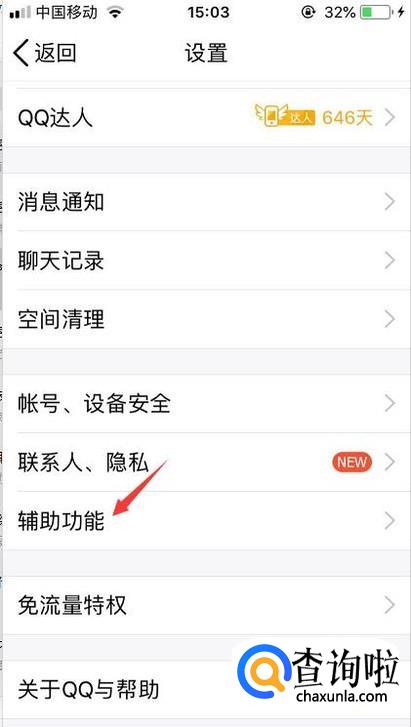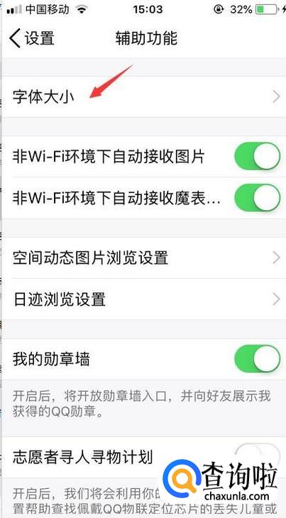 在辅助功能里面第一个就是字体大小的设置,点击一下。