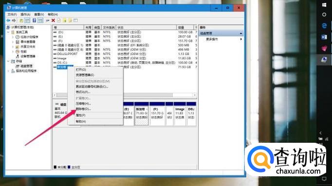 先在上面一部分中先找到G盘,右击,在弹出框选择【删除卷】,注意这儿选择的是【删除卷】,不是【压缩卷】,【压缩卷】是用来分盘的。