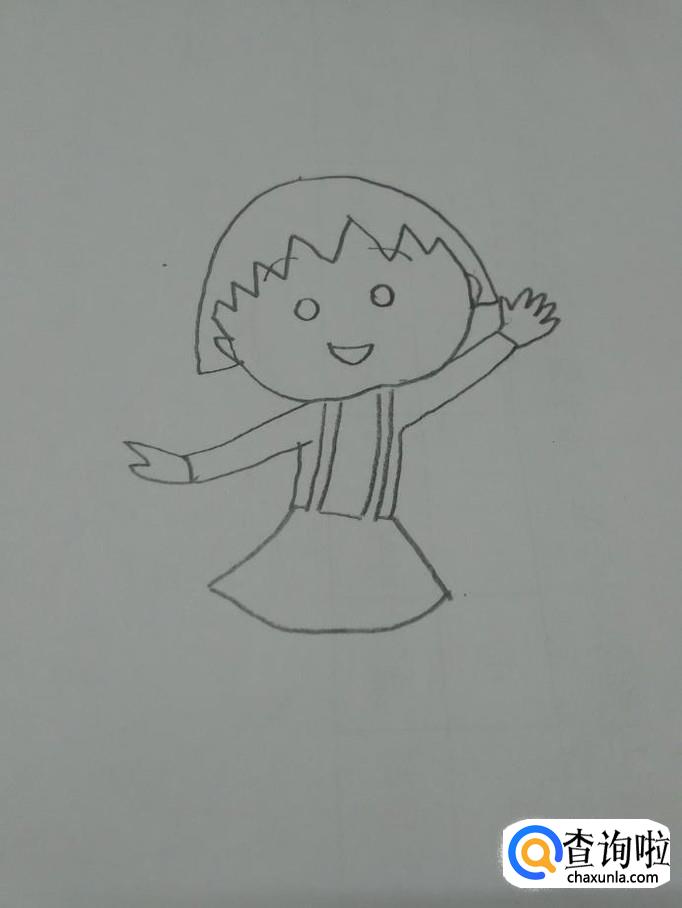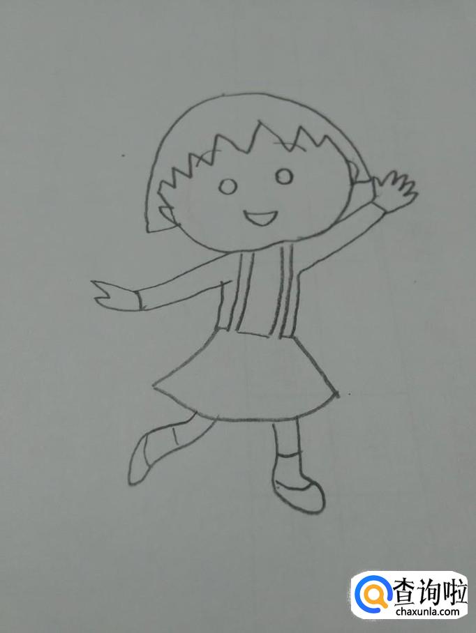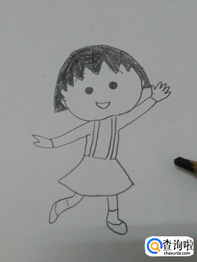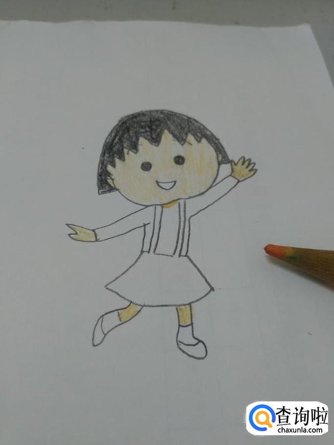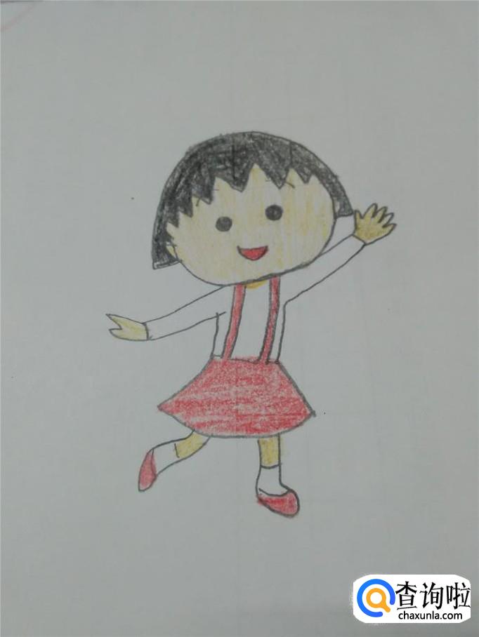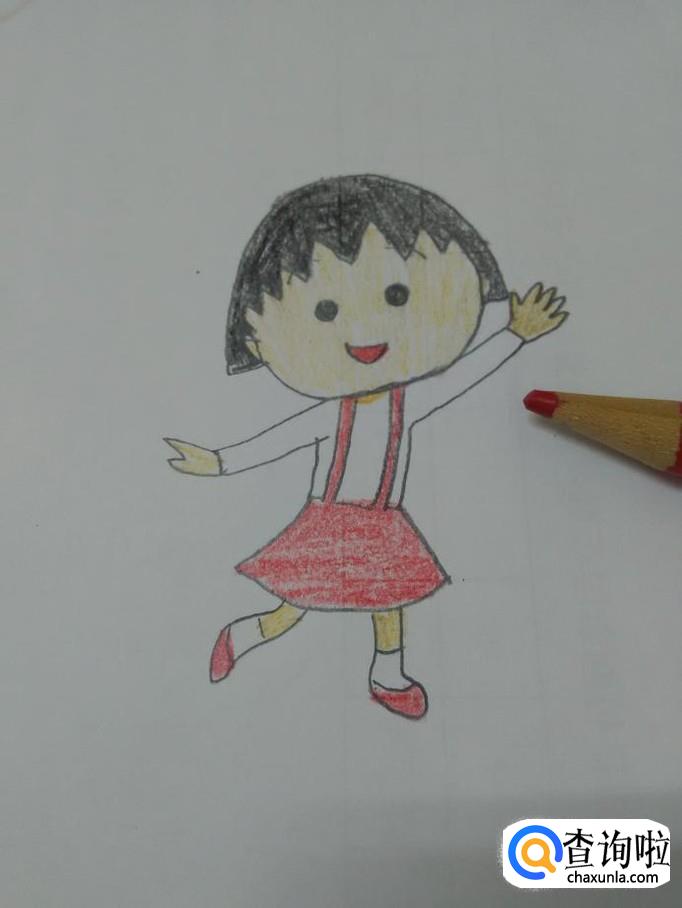 最后用红色涂她的嘴、背带裙和鞋,动漫人物小丸子就画完了。