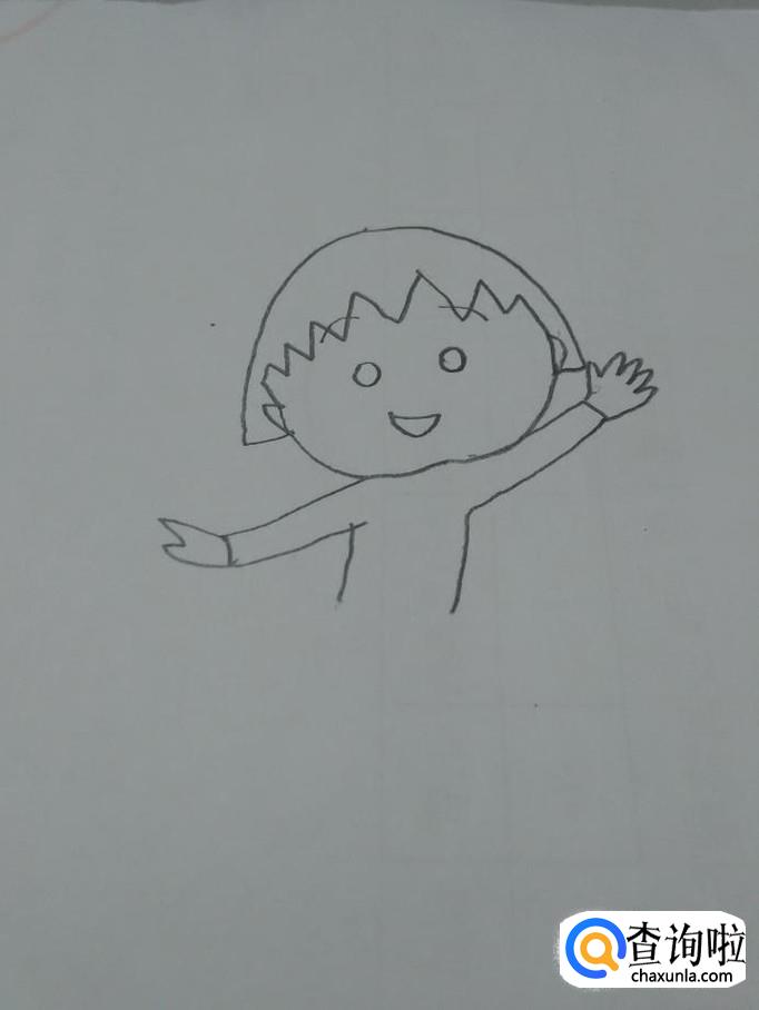 在头的下方,画出她的上身,两条胳膊是伸展开的,身体要画得瘦小一些,显得脑袋大大的。。