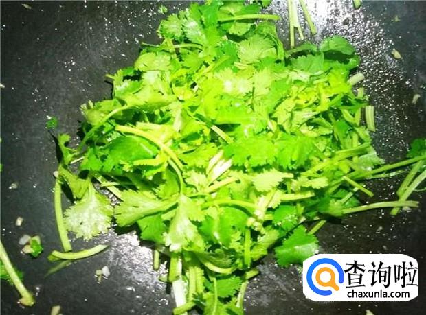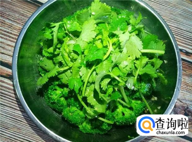 西兰花装盆子里,然后再把香菜放进锅里搅拌一下。