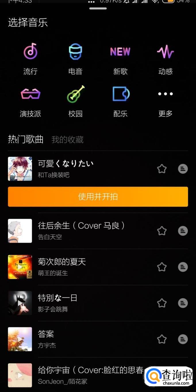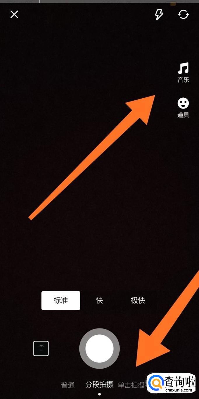 接着选择拍摄的模式,有“普通”“分段拍摄”“单击拍摄”和“来回”四个选项,按下白色圆形的按钮即可开始拍摄。还可以选择自己喜欢的音乐和道具加入到视频中。