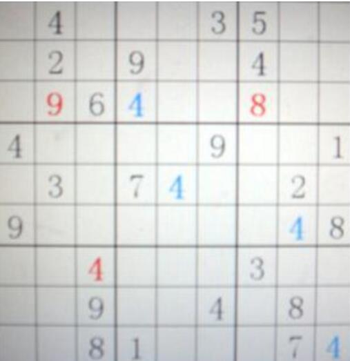双雄决位——图中蓝色的4个4,正是从下至上采用此招推导而出。下三行中已经两行有4,最后右下小九宫格中的最后一行7两旁的两个空格中,必有一4,眼睛往上看直列,两个空格中,有一列上面已经有4,另一个空位必定就是4了!同理,上面三个蓝4也是依此招填入。