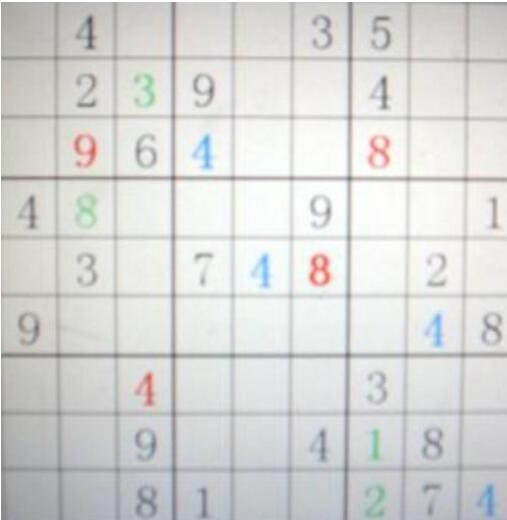 一将纵横——虽然在右边三列中,只有一个1,但是由于右上角的小九宫格中,5、4、8三个数字构成一列,排除了出现1的可能,因此1在此宫必定在当中一列之中,那么,右下角的一个九宫格中,1必定在3的这一列中,而3下的两个空格,下面一个空格横向已经有1,不能再出现1,所以,必在上面一个空格中,也就是用绿色标注的那个1。同理,3和8亦可利用某个小九宫格已有的成列或成行的数字,推断出另外一个小九宫格中的行列位置,然后再根据旁列或旁行的数字来进行简单的推断。然后再运用第1第3招,继续填出加粗的红8和绿2。