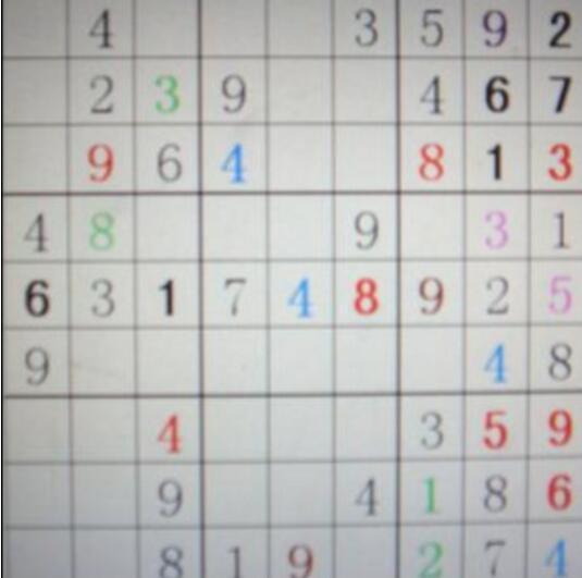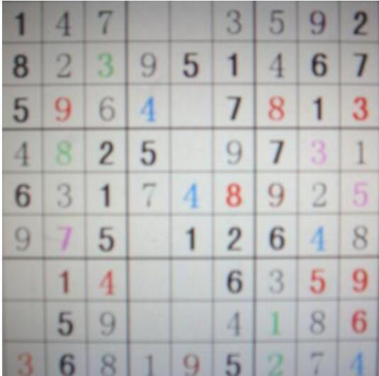余音自清——将行列中剩下的数字与旁行或旁列数字对比,也可确定某些数字的位置,例如下图右三列中的褐色数字9,就是因为从列上来看,这一列只剩下三个数字6、7、9,而9在行上来看,上下两行都有9,故中间必是9!最后一行的9,也是同理,因为最后一行剩余数字为3、5、6、9,而右下角小九宫格最后一行已满,左下角小九宫格中已经有9,则必在下面中间小九宫格最后一行中,对照上列,右列上方已经有9,所以,必在中列。