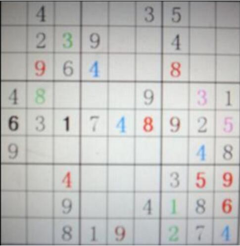 击叶中枝——有的数字虽然自身无法确定,但是可以帮助你确定其他数字。例如下图中左三列中间一小九宫格中的粉色5,由于这个小九宫格的最边一列上下两个空格可以根据整列其他数字推导出是6和7,虽然不知道谁6谁7,但是却可以帮助推导另外两个空格的剩余数字必为3和5,而第一列中间格的数字因为旁行已经有3,所以只能是5!而另一空位自然是3。然后,我们再用第1招,也可以推出下面一个粗红体的5。再用第4招加第2招,推出中间行左边小九宫格的6和1。