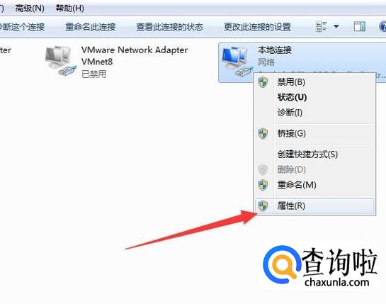 在适配器页面用鼠标右键点击本地连接。选择最下面的属性选项。