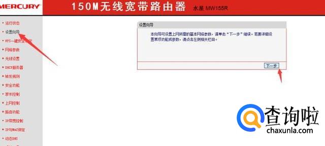 进入路由器后点击左侧的设置向导。在右侧页面会出现一个选项。,直接点击下一步。