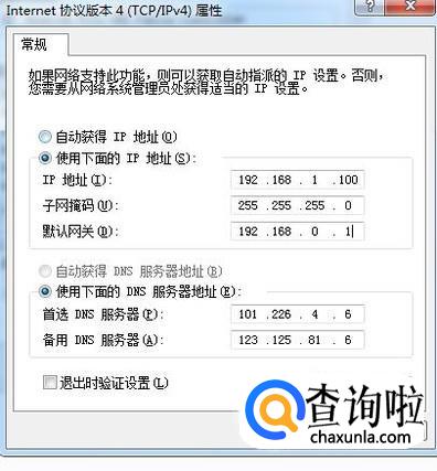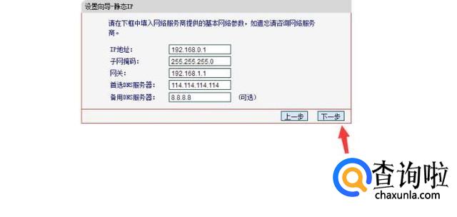 在ip地址栏填写上其他的ip号码,不能和网关一样。dns服务器ip很多的,也可以在网站搜索或者直接输入:114.114.114.114 8.8.8.8 等等。填写好之后点击下一步。