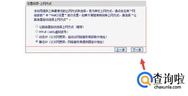接着会到上网模式选择页面,选择静态ip选项。然后点击下一步