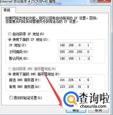 用鼠标双击internet协议版本4.在出现IP页面把IP修改为和路由器一样的IP:192.168.0.1。dns服务器IP也要修改一样。114.114.114.114 8.8.8.8 修改完成后点击确定。