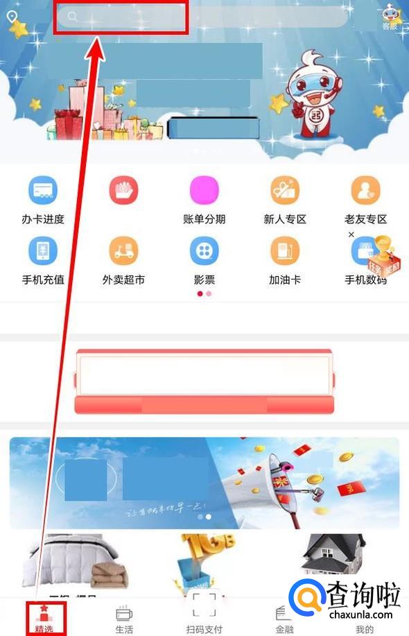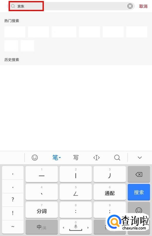 点击精选页面,点击上方的搜索框,输入京东,会弹出备选项;