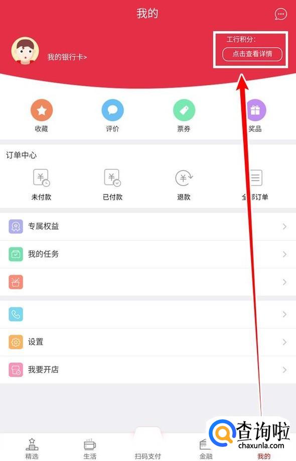 打开工银e生活,点到“我的”页面,查看自己的工行积分,也可点击“查看详情”查看积分明细;