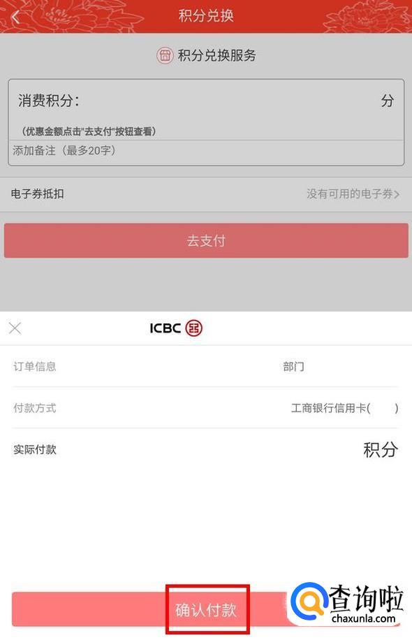 接下来就是支付了,点击去支付,因为是积分兑换,所以选择工行信用卡;