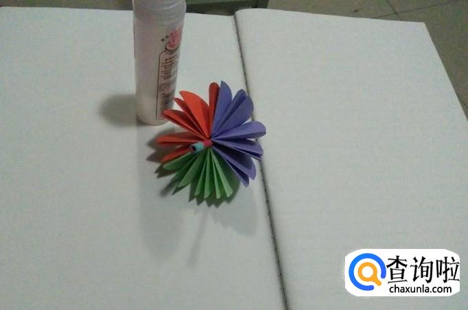 将刚刚做好的扇形展开一半,在折痕处图上胶水,再折回去,然后按下图2所示在末部图上胶水,