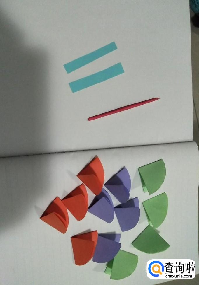 在最后一片扇形上多涂一些胶水,然后我们将圆棍放在图上胶水的一边的直角边旁,将所有的粘好的扇形拉开,首末两片粘起来,形成一个圆弧的伞面