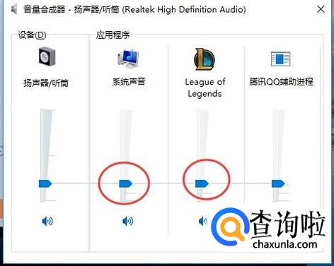 在LOL打开的情况下,对“扬声器”和“英雄联盟”音量进行调整,如图所示。