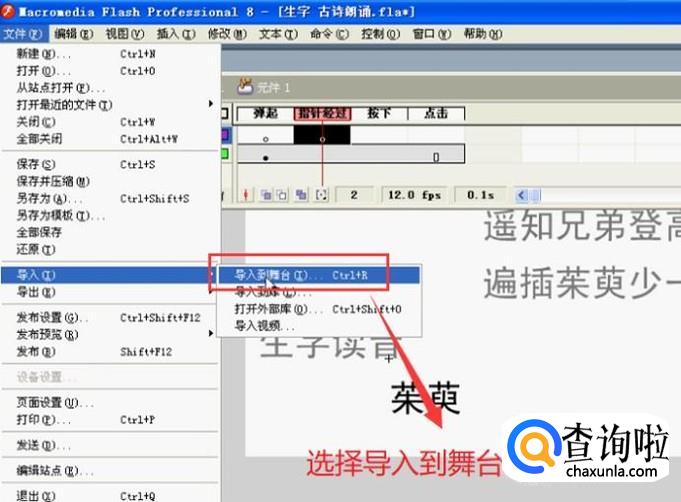 接下来点击左上角的文件菜单,选择导入下面的导入到舞台选项,如下图所示