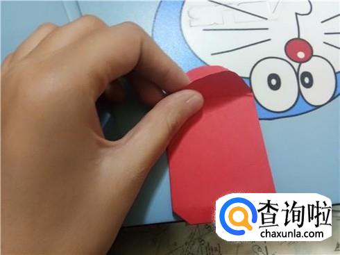 最后,在下边用小刀开一个口,将上边的半圆拉下来放进口里面,并且将之前准备的小圆圈粘在开的口上面,这样一个红包就折好了。