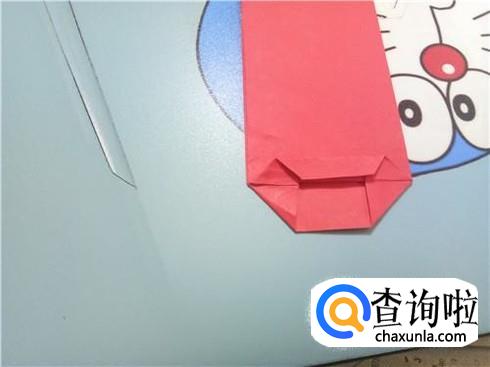 再沿着顺时针或者逆时针旋转90°,将下边的一条边向上折叠一小部分过后沿着刚才折叠出的线将两边折过去形成两个小的三角形。