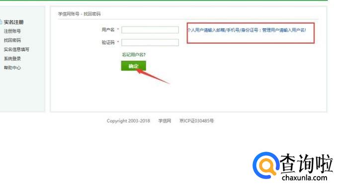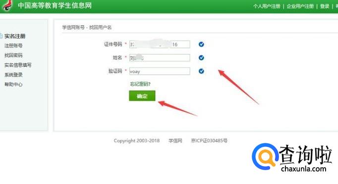 输入你记住的用户名,如果没记住就输入身份证号码,输入验证码点击确定。