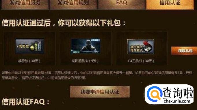 信用认证通过后,每个QQ号可以领取一个游戏礼包,里面有手雷包,幻影工具卡,C4工具钳。