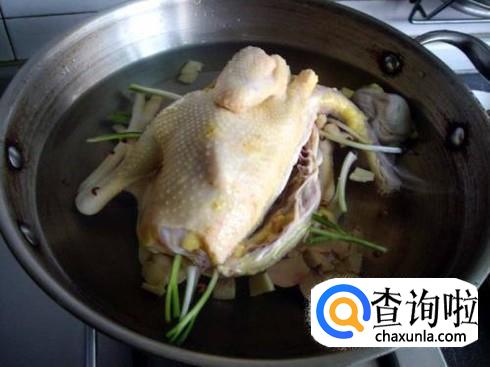 煮锅里加水烧开,把鸡焯一下水,再给锅里重新加入清水,放入焯过水的鸡,葱段,姜片等,等水再次烧开后煮上10分种,然后盖上锅盖焖上30分种,鸡就差不多熟了。