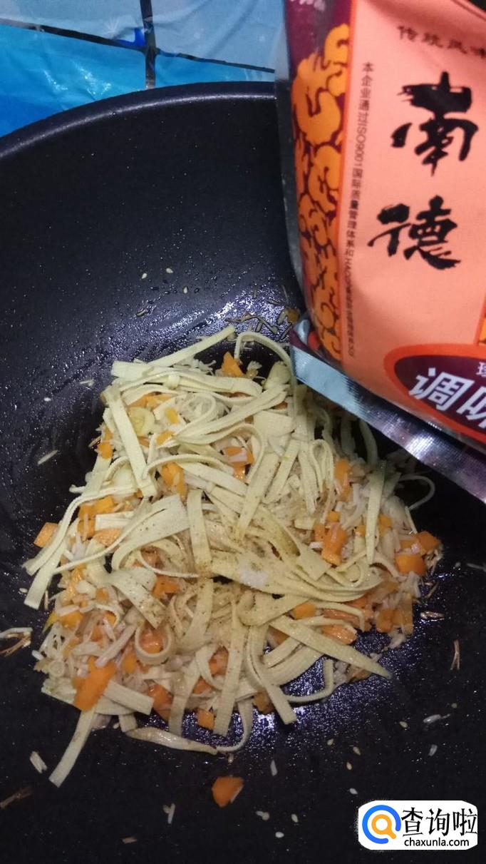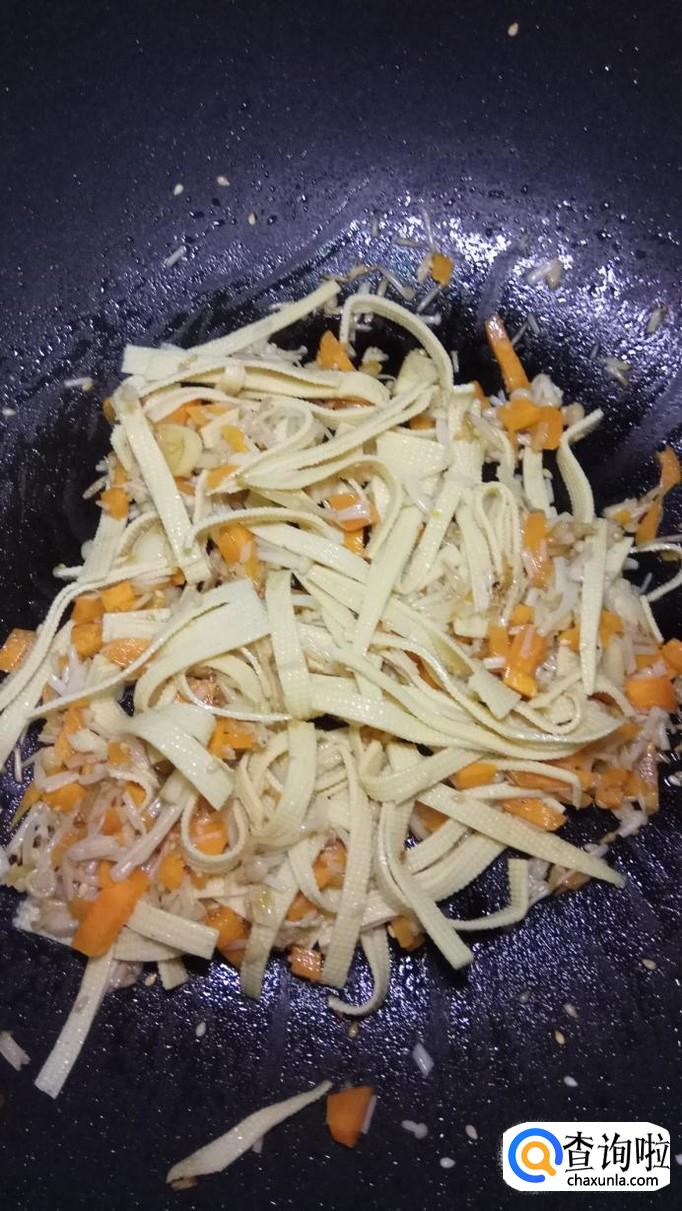 将切好的豆腐皮,倒入锅中,翻炒均匀,如图所示。