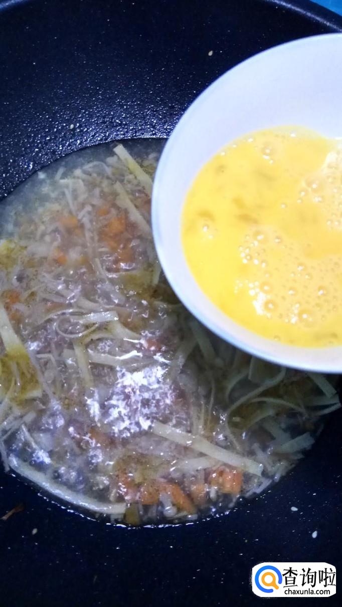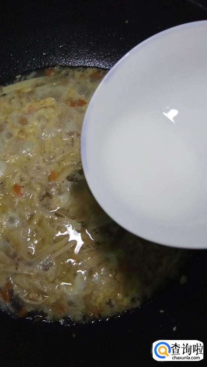 碗中放入少许水淀粉,搅匀之后倒入锅中,勾芡一下,出锅前加入少许鸡精,搅拌均匀。