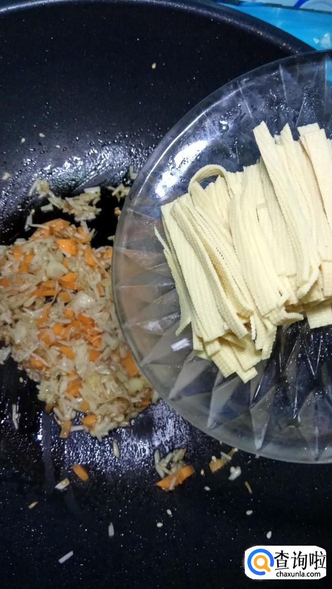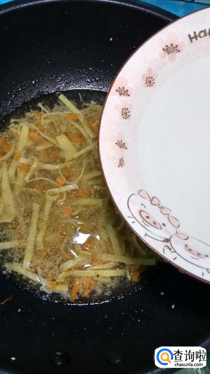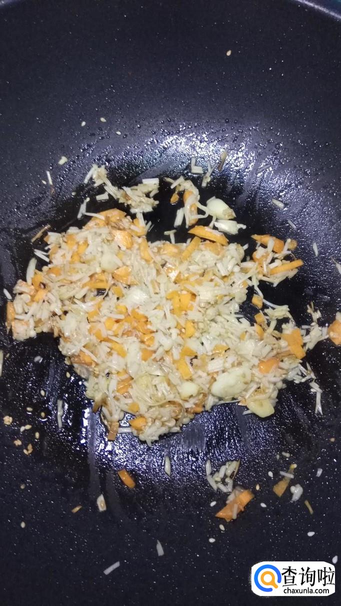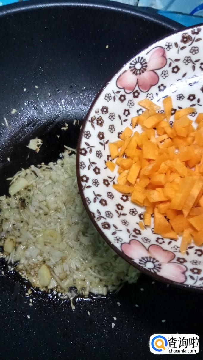 准备适量胡萝卜,切成小丁儿,倒入锅中,和金针菇一起翻炒,营养又好看。