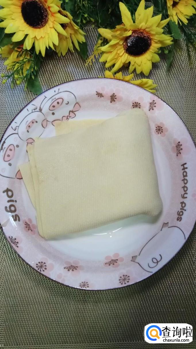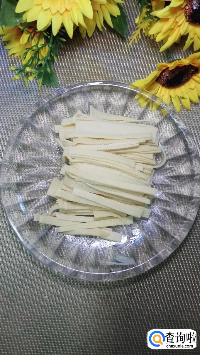 准备适量豆腐皮,洗净后切成短条,如图所示。吃不完的豆腐皮可以放入冰箱冷冻,吃的时候取出解冻就可以了。