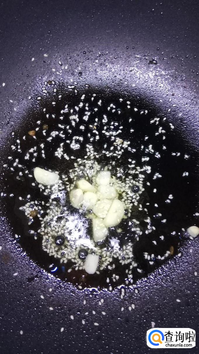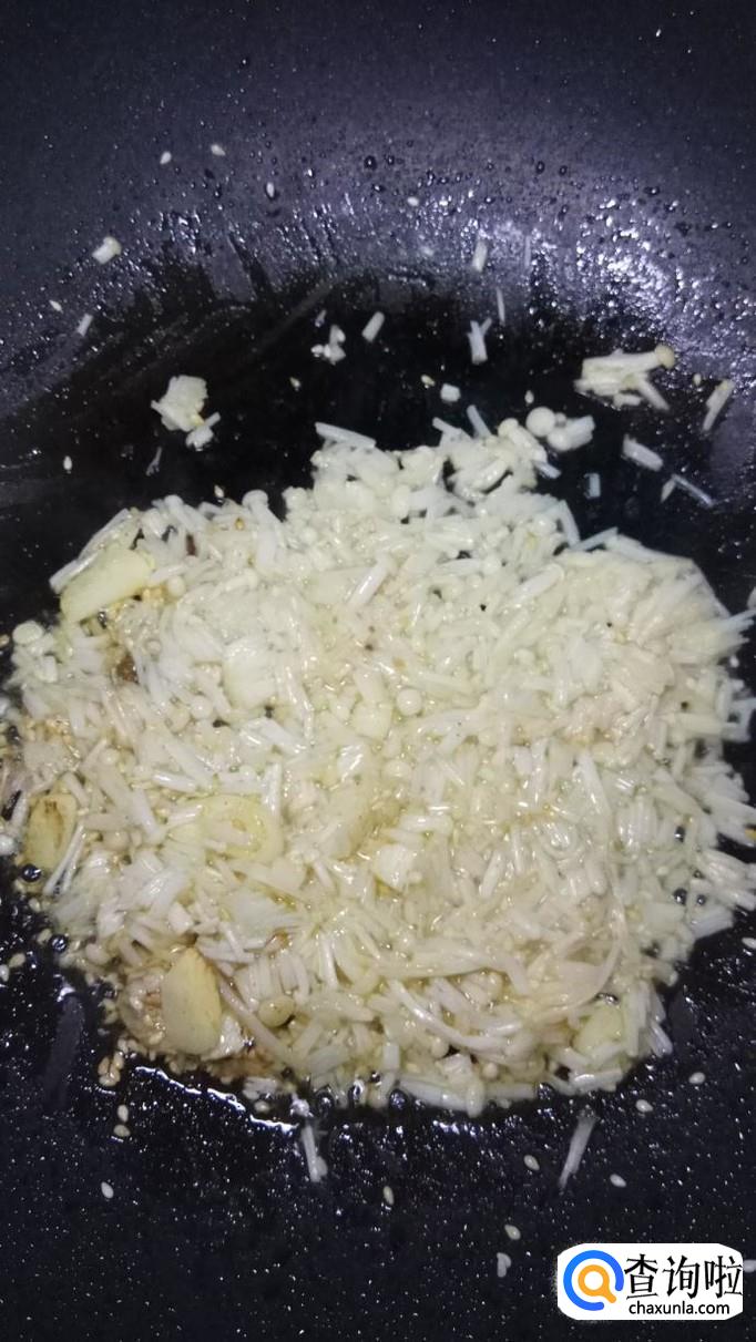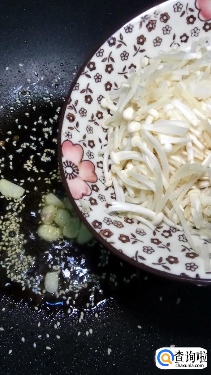炒锅中放入适量油,油热后放入蒜片爆香,也可以放入少许生芝麻,这样香味更浓。然后将切好的金针末,倒入锅中,翻炒均匀。