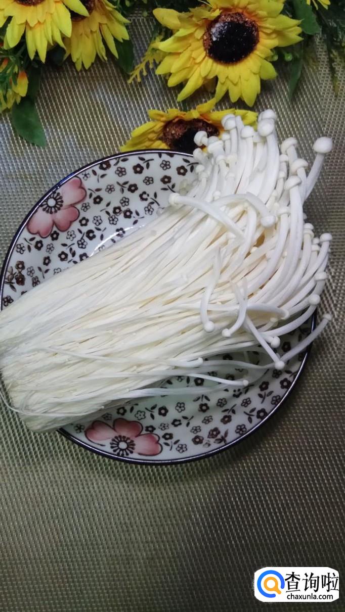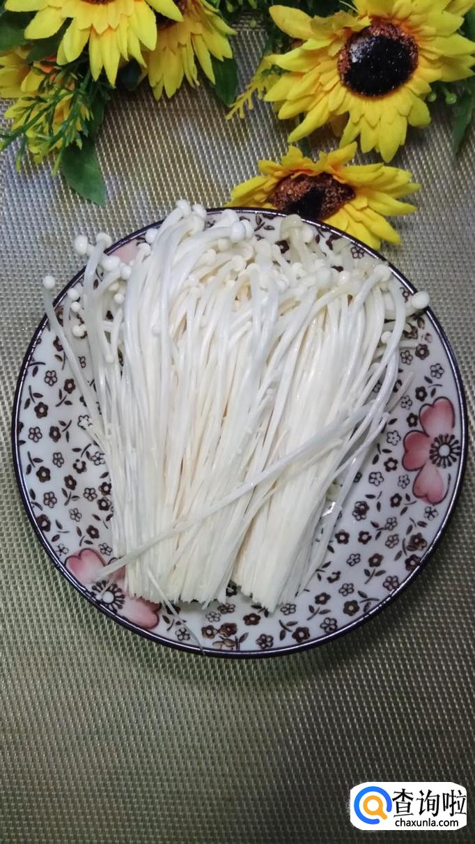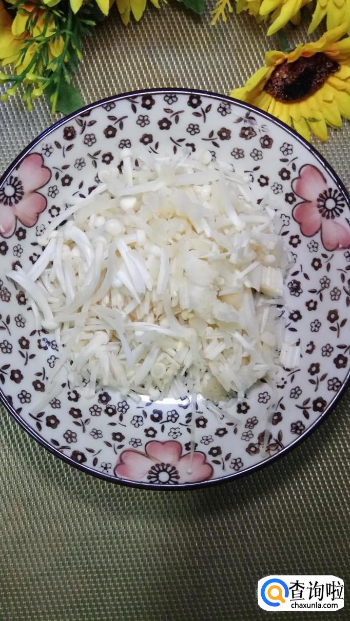 准备适量金针菇,去根洗净,然后用刀切成碎末,金针菇比较容易塞牙缝,这样做就避免了这种情况,并且其营养更容易被人体吸收。