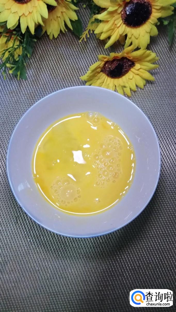 碗中打入一个鸡蛋,加入适量食盐,打散后倒入锅中,用筷子搅匀。