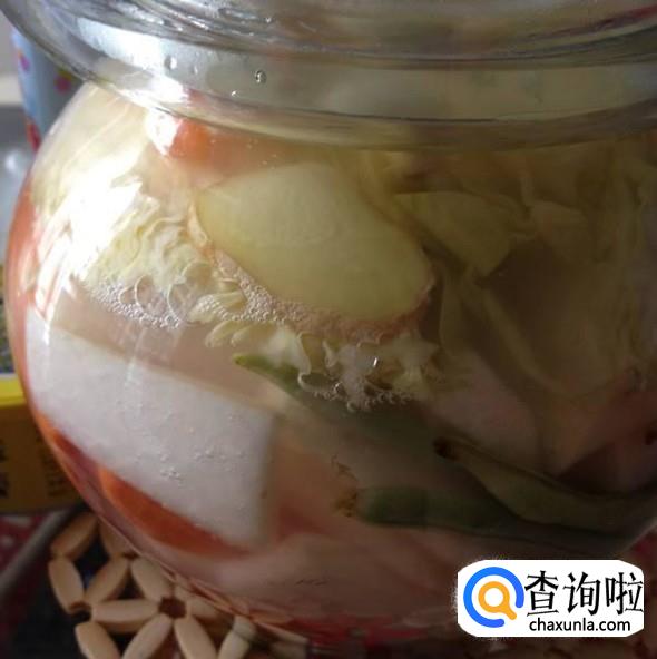 将控干水分的卷心菜,和小米椒,姜片,200克白糖,放在玻璃瓶里,倒入白醋,白醋没过卷心菜,盖上盖子腌制7天就可以了。