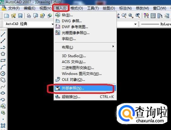 首先,我们打开CAD软件。点击菜单栏“插入”,然后在下拉菜单中选择“外部参照”。