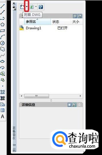 出现“外部参照”面板,我们点击左上角“附着”按钮旁边的下拉菜单箭头。