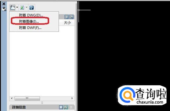 下拉菜单中有三个选项,如图所示,如果我们需要参照的是其他CAD图纸,就点击“附着DWG”,如果参照图片,就点击“附着图像”,如果参照的是DWF图形,就点击“附着DWF”。我们以参照普通图片为例,来演示一下效果。点击附着图像。
