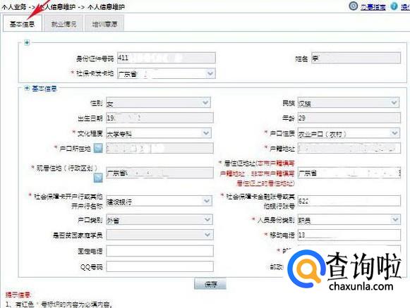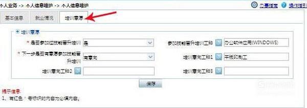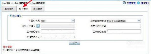 进入个人信息维护页面,请按照要求如实输入相关资料,基本信息,就业情况,培训意愿,填写好后点击保存。如不清楚怎么填表,可以看网页右上方“办事指南”和“操作指引”。