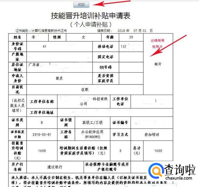 提交后,则进入如下页面,办理状态显示审核中,点击打印,即可打印技能晋升培训补贴申请表。