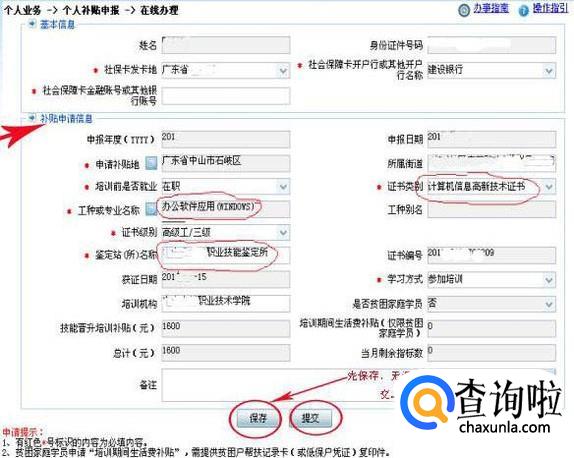 进入在线办理页面后,请认真如实填写相关资料,带红色*号标示的内容为必填内容,填好后点击保存,检查后无误,点击提交,即完成个人申请。