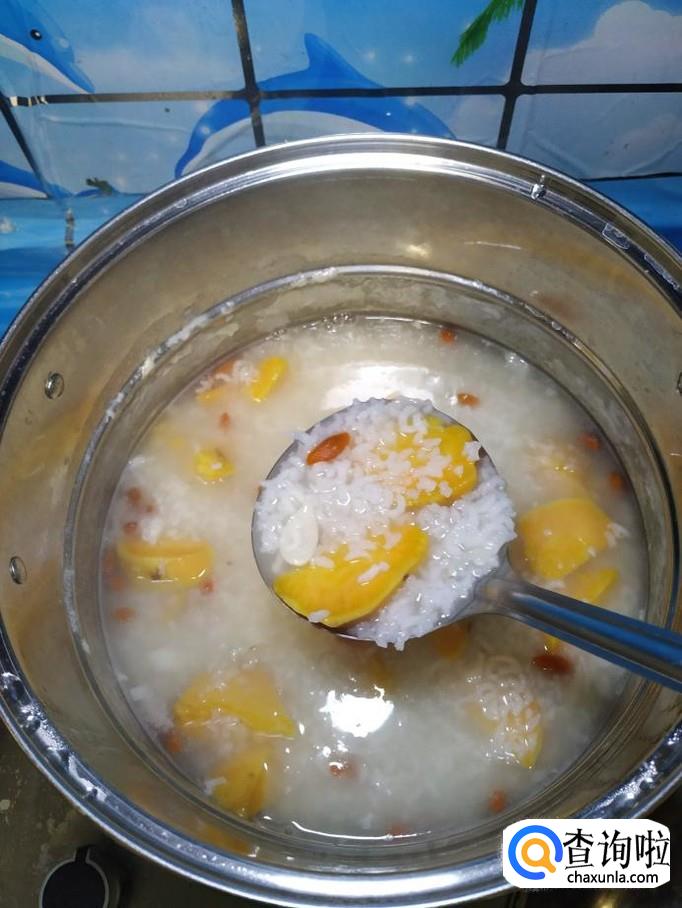 将泡好的百合和枸杞子倒入锅中,泡好之后,这些食材的营养会更容易进入到粥中。