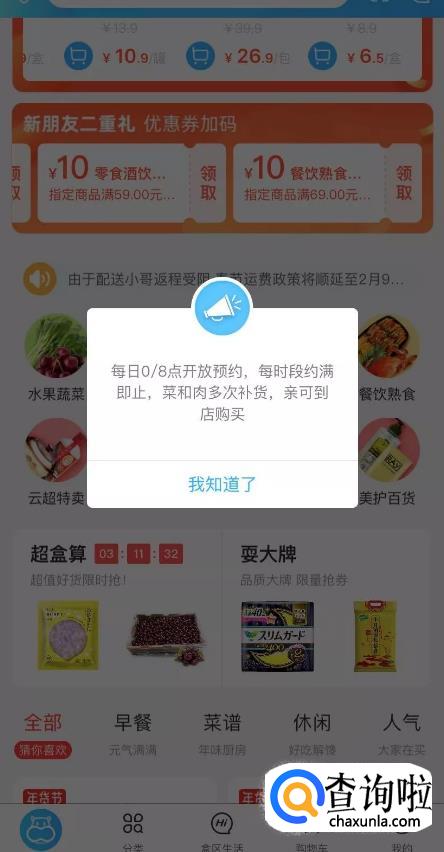 最近几天盒马的外卖配送一直约不上,现在每日0/8点开放预约,但因为人员有限,所以还是预定满了就不能配送了。
