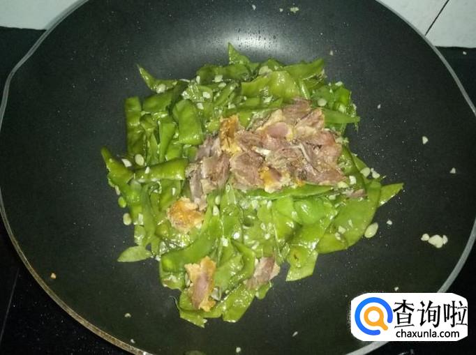 待刀豆八成熟时放入备好的腊肉,再放入适量的盐和鸡精轻轻翻炒,炒至刀豆成熟就可以出锅享用啦!