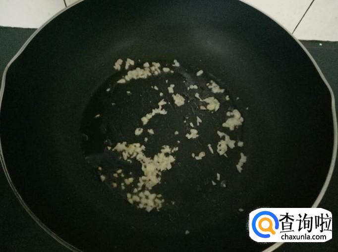 锅烧至七成热放入适量食用油,然后把切碎的大蒜放入锅里煸至散发香味。