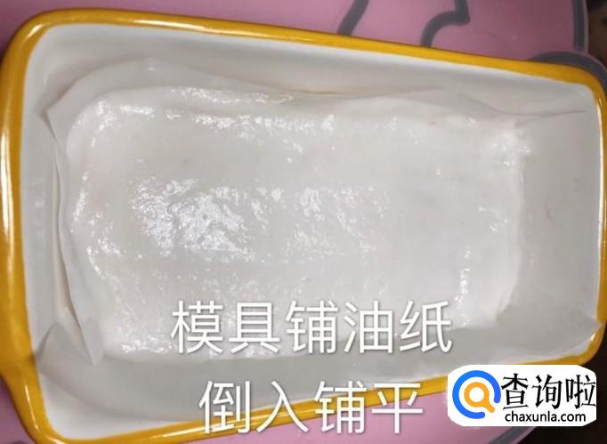 接着在模具上铺上一层油纸倒入面糊,之后在表面铺上一层保鲜膜,如下图所示。