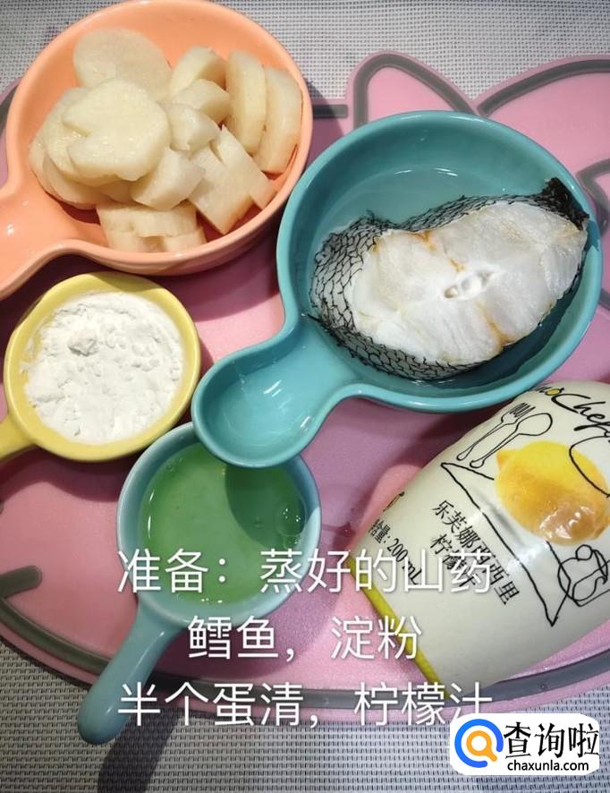 首先准备好蒸好的山药、鳕鱼淀粉、蛋清半个和柠檬汁,如下图所示。