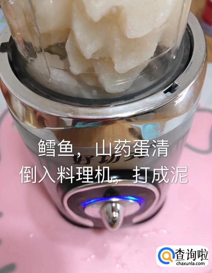 接着将雪鱼、山药和蛋清一起倒入料理机中打成泥,如下图所示。