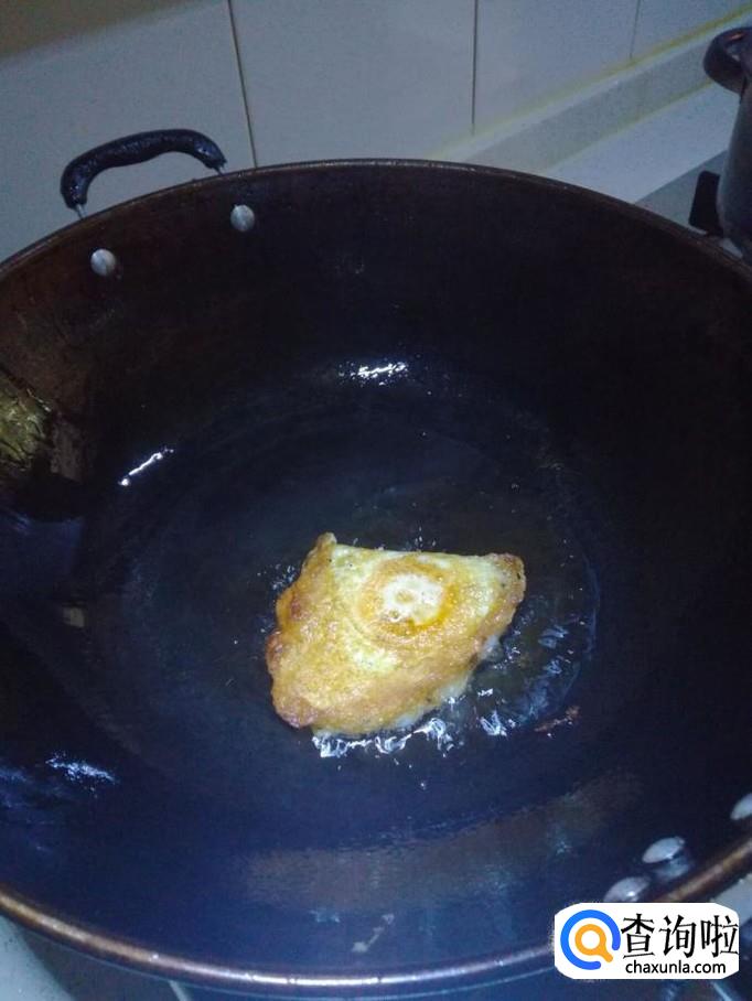 转小火,将鸡蛋的一面煎黄后,用铲子翻起煎另一面。