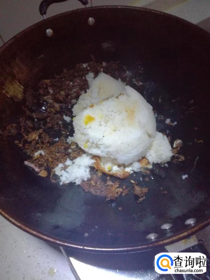 然后把备好的炒饭倒入锅里。